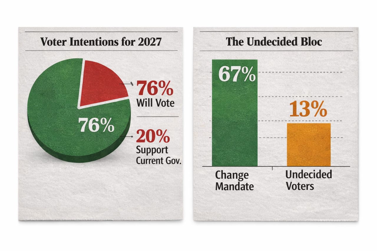 The report frames the 2027 election cycle as a de facto referendum on the sitting government, arguing that the surge in participation intent is not an endorsement of the status quo but rather a mobilization driven by dissatisfaction.