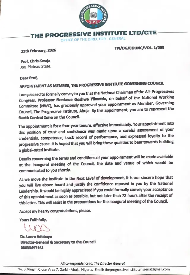 According to the letter, the decision was endorsed on behalf of the party’s National Working Committee (NWC). The Institute described the appointment as a recognition of Professor Kwaja’s “credentials, competence, track record of performance, and expressed loyalty to the progressive cause.”
