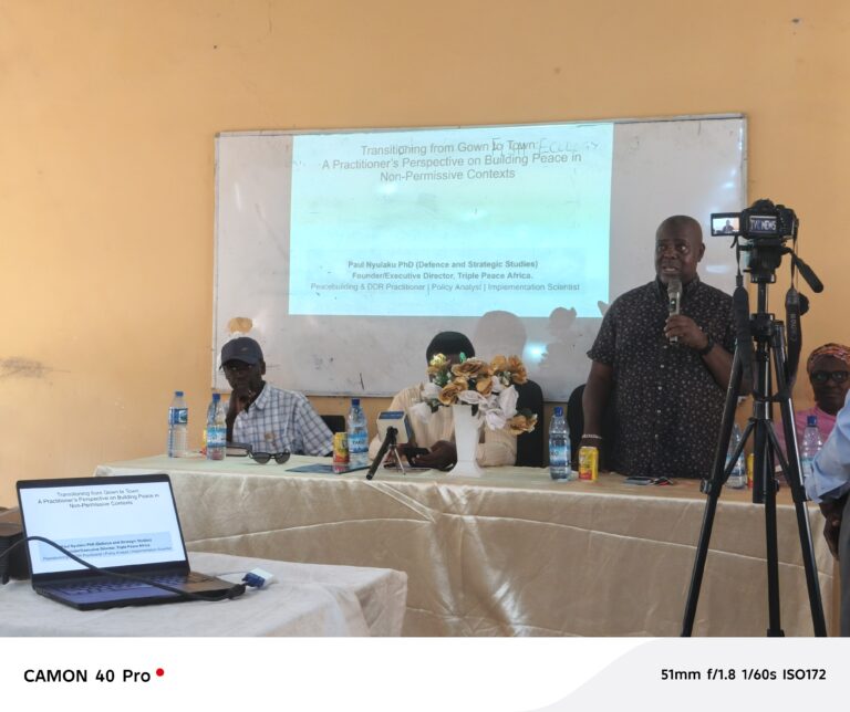 The lecture, titled “Transitioning from Gown to Town: A Practitioner’s Perspective on Building Peace in Non-Permissive Contexts,” was delivered by Paul Nyulaku, a peacebuilding and disarmament, demobilisation and reintegration (DDR) practitioner and Founder of Triple Peace Africa .